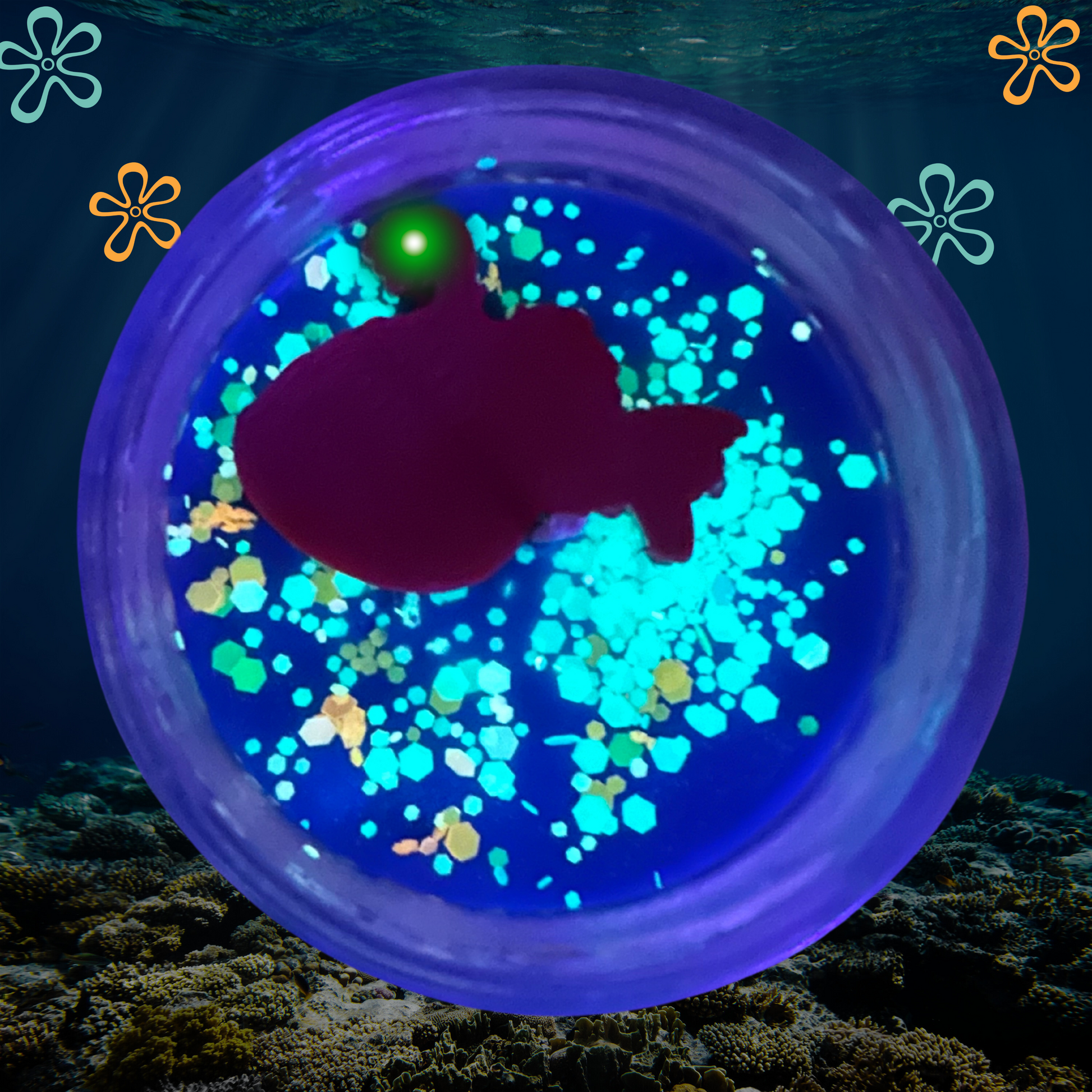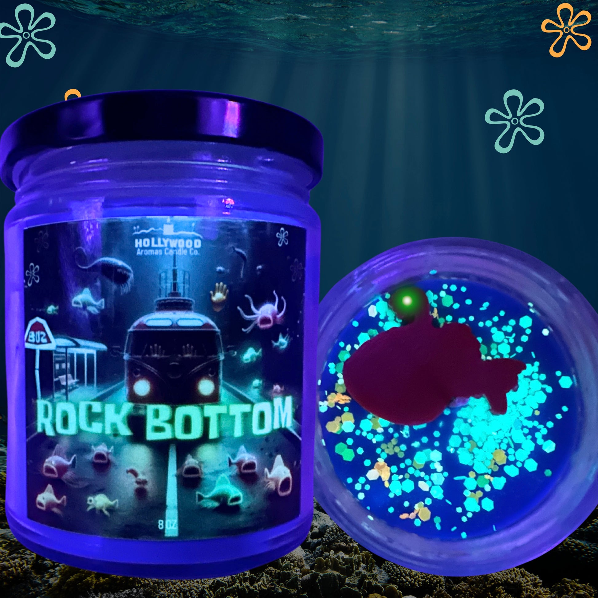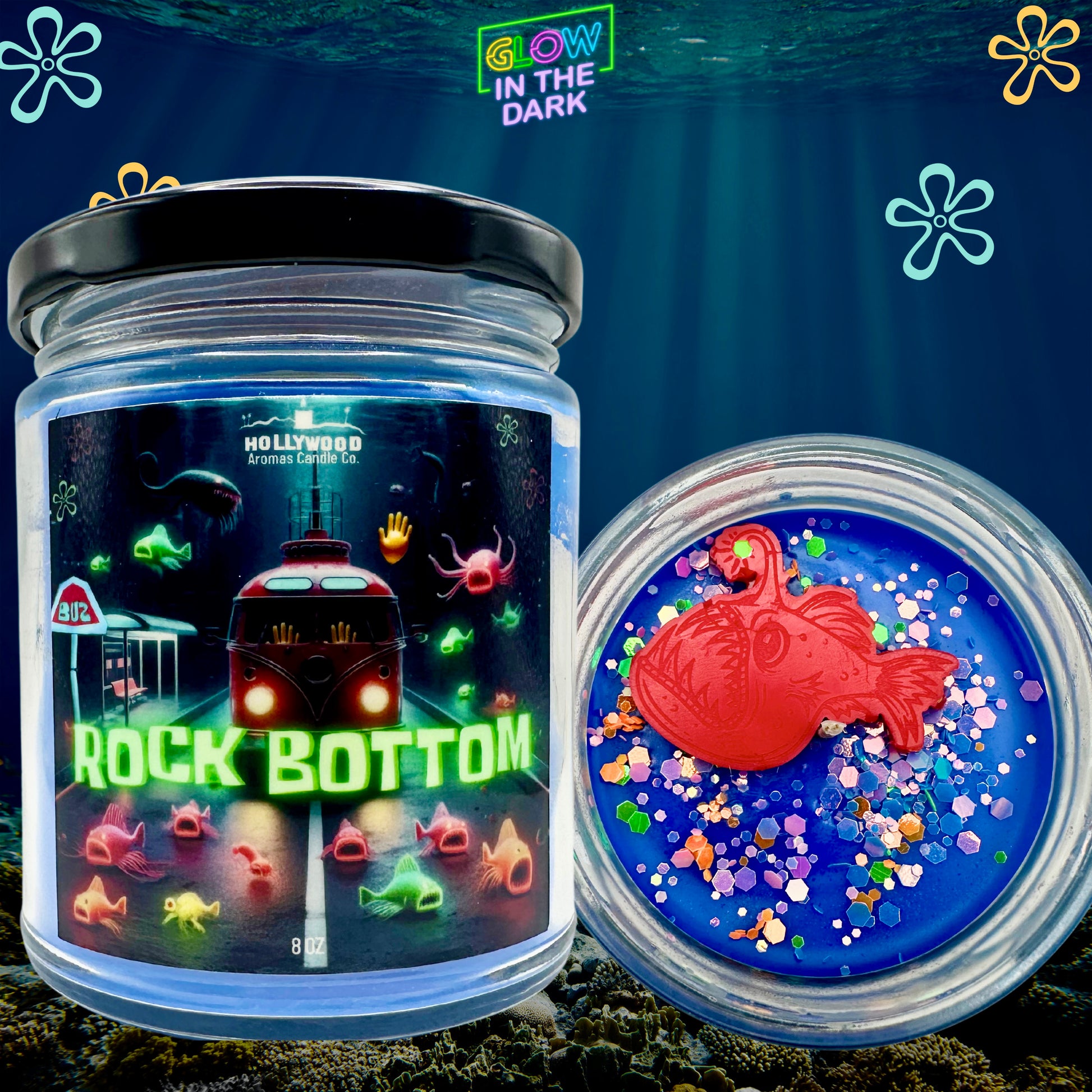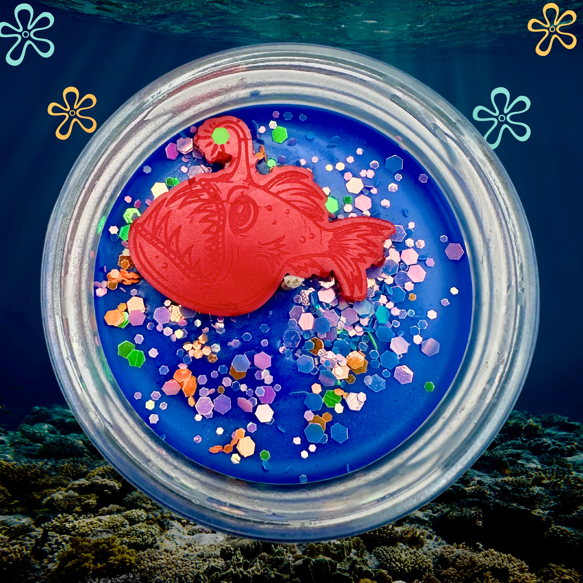 This is a deep aquatic scent with elements of exotic fruit that truly set the bioluminescence scene. And it’s topped with a mixture of our environment-safe biodegradable glow in the dark glitter, and even an angler fish similar to the one on the show!